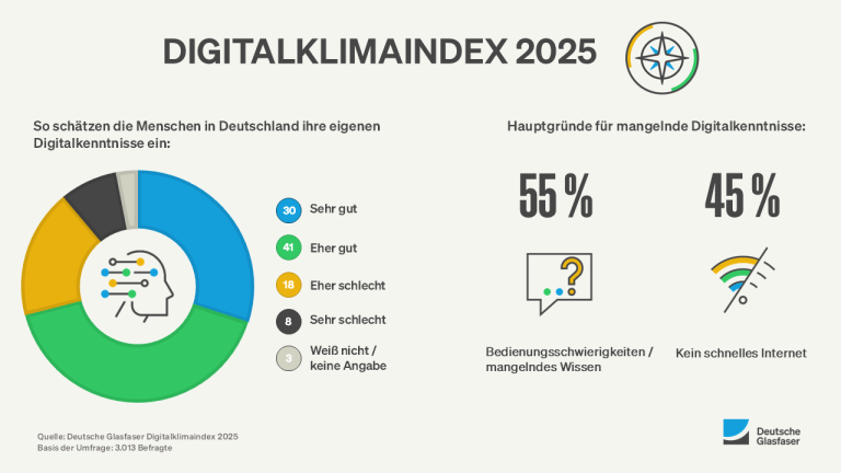Laut den Daten des Digitalklimaindex bewerten 71 Prozent der Menschen in Deutschland ihre Digitalkenntnisse als gut oder sogar sehr gut – ein Zeichen dafür, dass sich die Bevölkerung digital zurechtfindet. Gleichzeitig bestehen nach wie vor Hemmnisse im digitalen Alltag: 55 Prozent der Befragten sehen mangelndes Wissen oder Schwierigkeiten in der Bedienung digitaler Geräte als zentrale Barrieren. 45 Prozent beklagen einen fehlenden Zugang zu schnellem Internet – besonders in ländlichen Regionen.