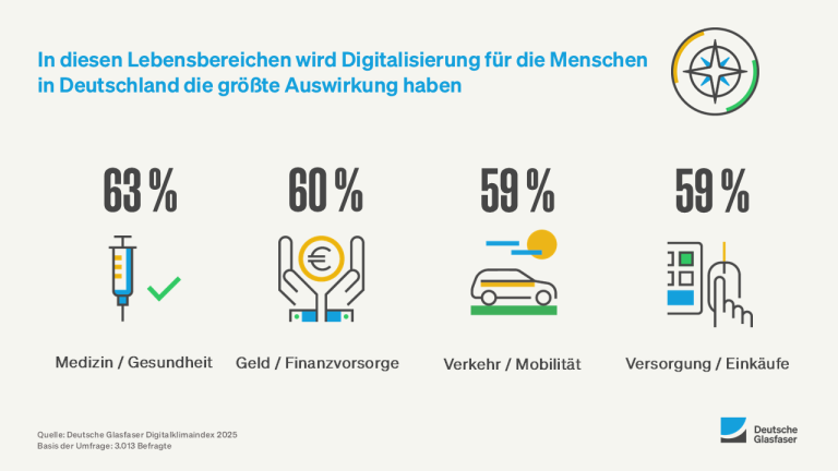 Ein besonders deutlicher Trend zeigt sich bei der Frage, auf welche Lebensfelder Digitalisierung künftig den größten Einfluss haben wird: Eine Mehrheit der Befragten geht davon aus, dass digitale Lösungen im Bereich Medizin und Gesundheitsvorsorge eine zentrale Rolle einnehmen werden. Auch in den Bereichen Geld und Finanzvorsorge, Versorgung und Einkauf sowie Verkehr und Mobilität erwarten die Menschen starke digitale Veränderungen.